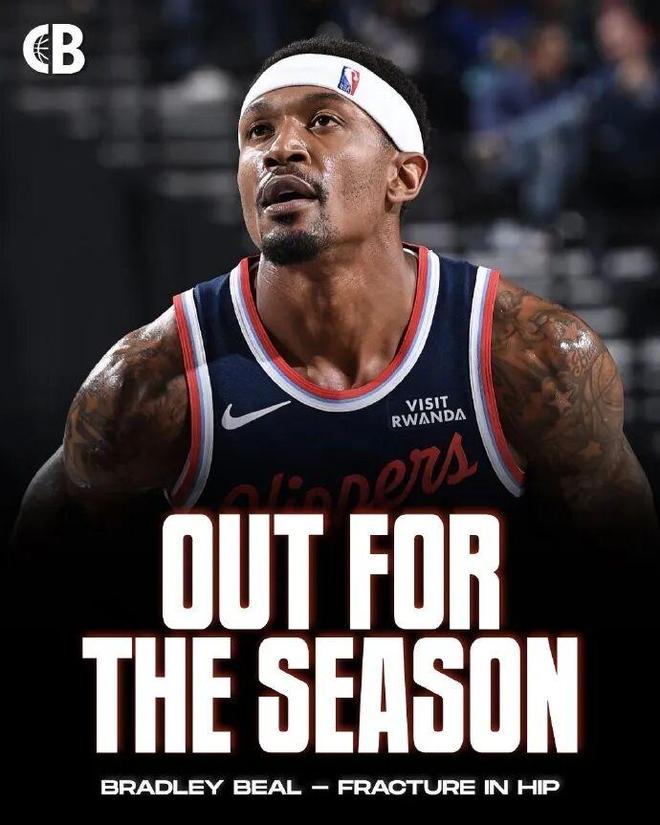 Shams一条新闻击沉快船,据 ESPN 消息人士透露,快船后卫布拉德利-比尔髋部骨折,将接受手术,赛季报销,恢复时间6-9月。