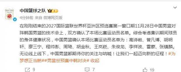 “综合考虑集训期间球员的身体健康状况,中国男篮确认本场比赛运动员名单为:高诗岩、曾凡博、胡明轩、廖三宁、程帅澎、周琦、胡金秋、王岚嵚、朱俊龙、李祥波、雷蒙、张镇麟。”